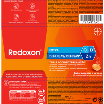 Com a sua tripla ação, Redoxon Extra Defesas atua nas 3 barreiras naturais do organismo, ajudando a reforçar o sistema imunitário. A Vitamina C e o Zinco são dois antioxidantes eficazes e contribuem para a proteção das células contra as oxidações indesejáveis e para o normal funcionamento do sistema imunitário.