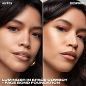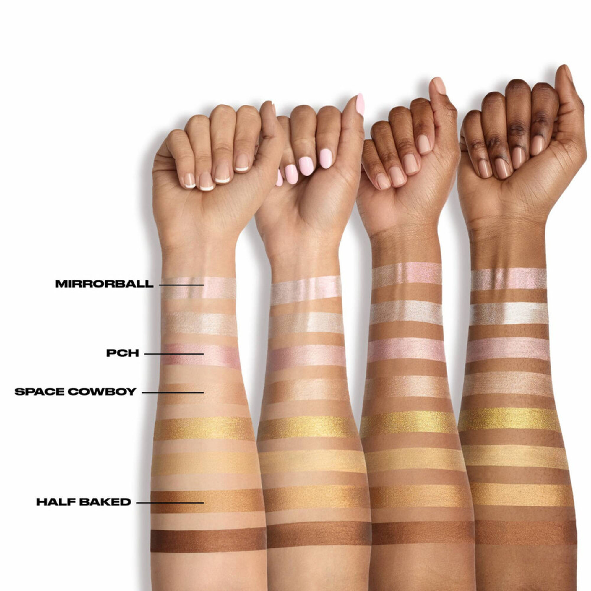 Face Bond Luminizer contém 4 diferentes tons, adaptados a diferentes tonalidades de pele e acabamentos. Junte-se ao makeup no makeup com as gotas bronzeadoras Half Baked, ou proporcione um toque de luz às suas bochechas, parecendo que está sempre sob os efeitos da luz.