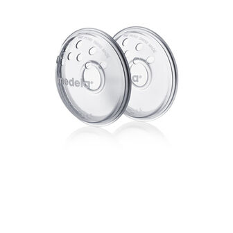 Os formadores de mamilo da Medela têm duas peças: uma membrana de silicone macia e flexível que é suave para a pele e uma concha exterior com orifícios no topo que permitem que o ar circule, evitando a humidade. A forma da concha exterior foi otimizada para criar um ajuste aconchegado e confortável e é discreta, de forma a não se ver através da roupa. Para usar, siga estes passos simples:
