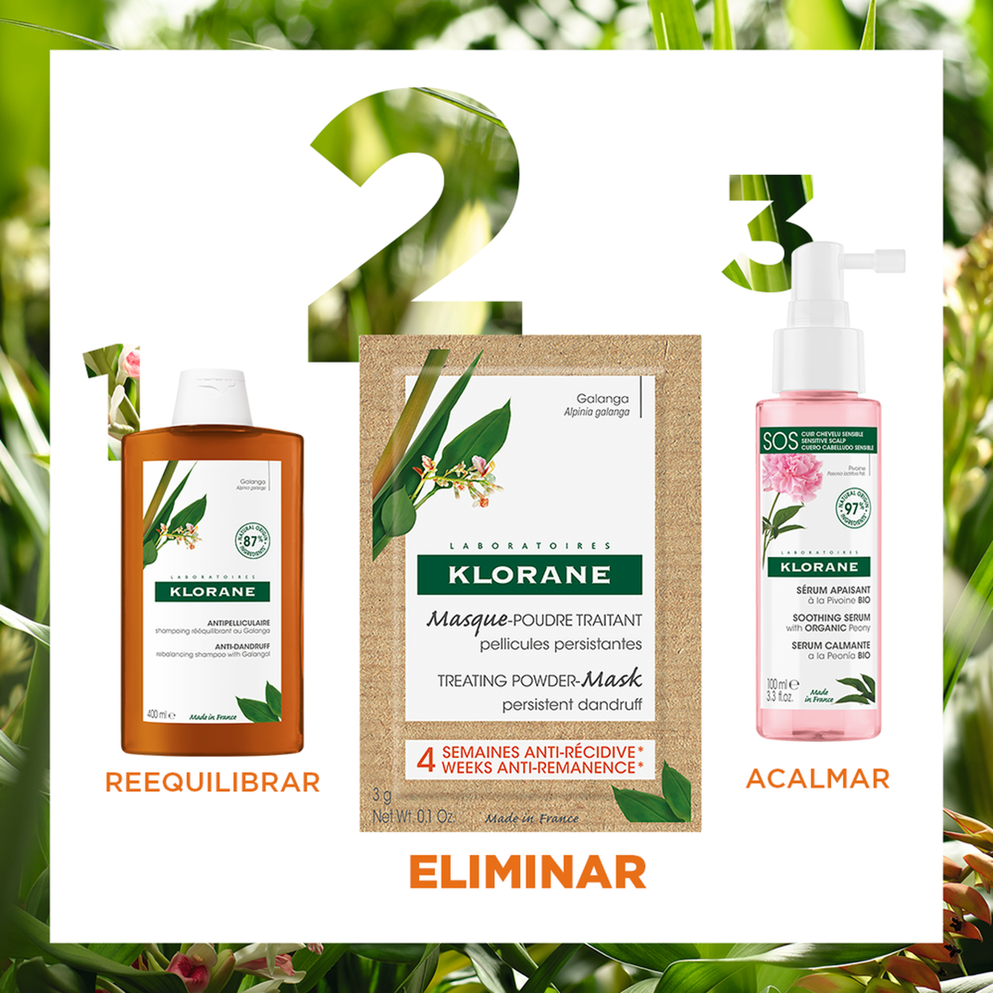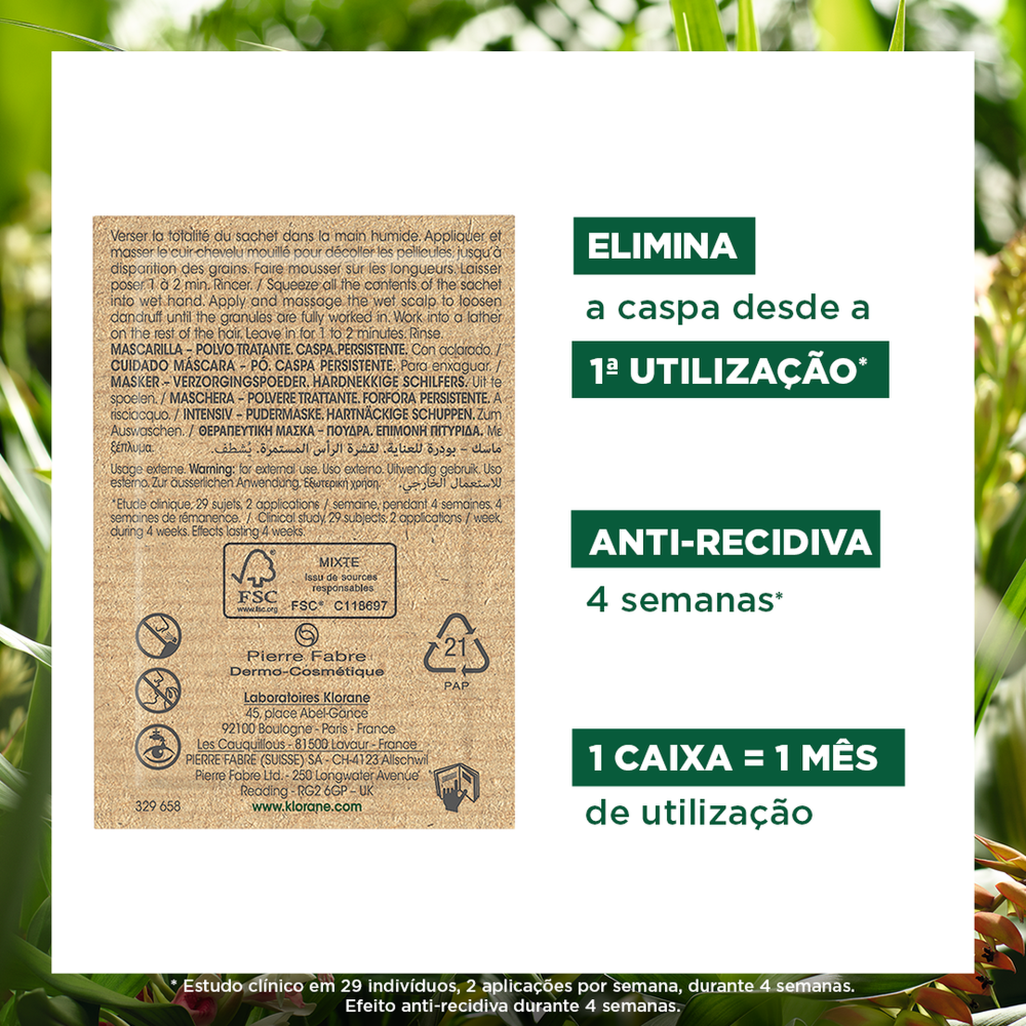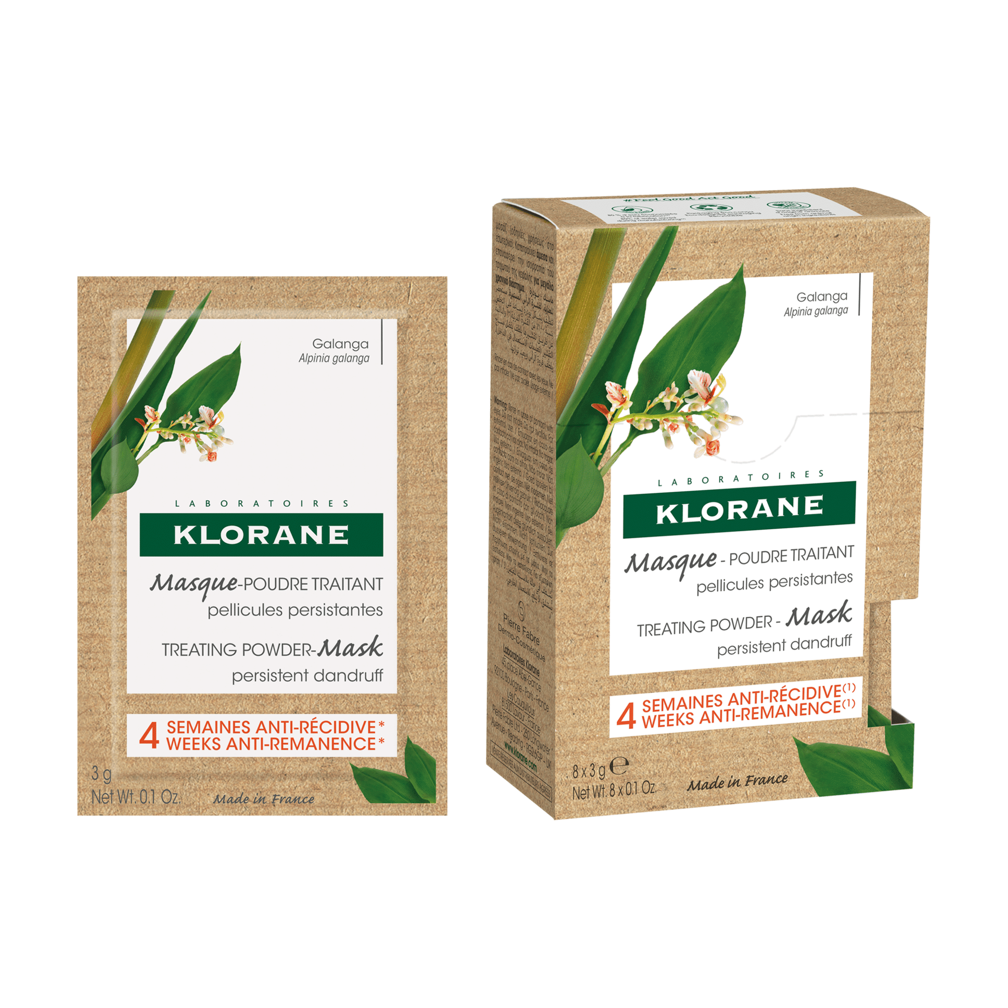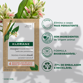 A Máscara de Cuidado em Pó Galanga de Klorane ajuda a eliminar eficazmente todos os tipos de caspa, mesmo a mais persistente, desde a primeira utilização. Este cuidado capilar em pó com Galanga, um ingrediente ativo natural que atua 4 vezes mais rapidamente que a Piritiona de Zinco**, acalma de imediato, reequilibra duradouramente o couro cabeludo e evita o reaparecimento da caspa durante até 4 semanas*. Quando em contacto com a água, este pó com os seus suaves grãos esfoliantes transforma-se numa espuma cremosa que, uma vez enxaguada, deixa o cabelo macio, saudável e livre de caspa. Para ser usado durante um mês, 2 saquetas por semana em substituição do seu champô e produtos habituais de cuidado do cabelo.