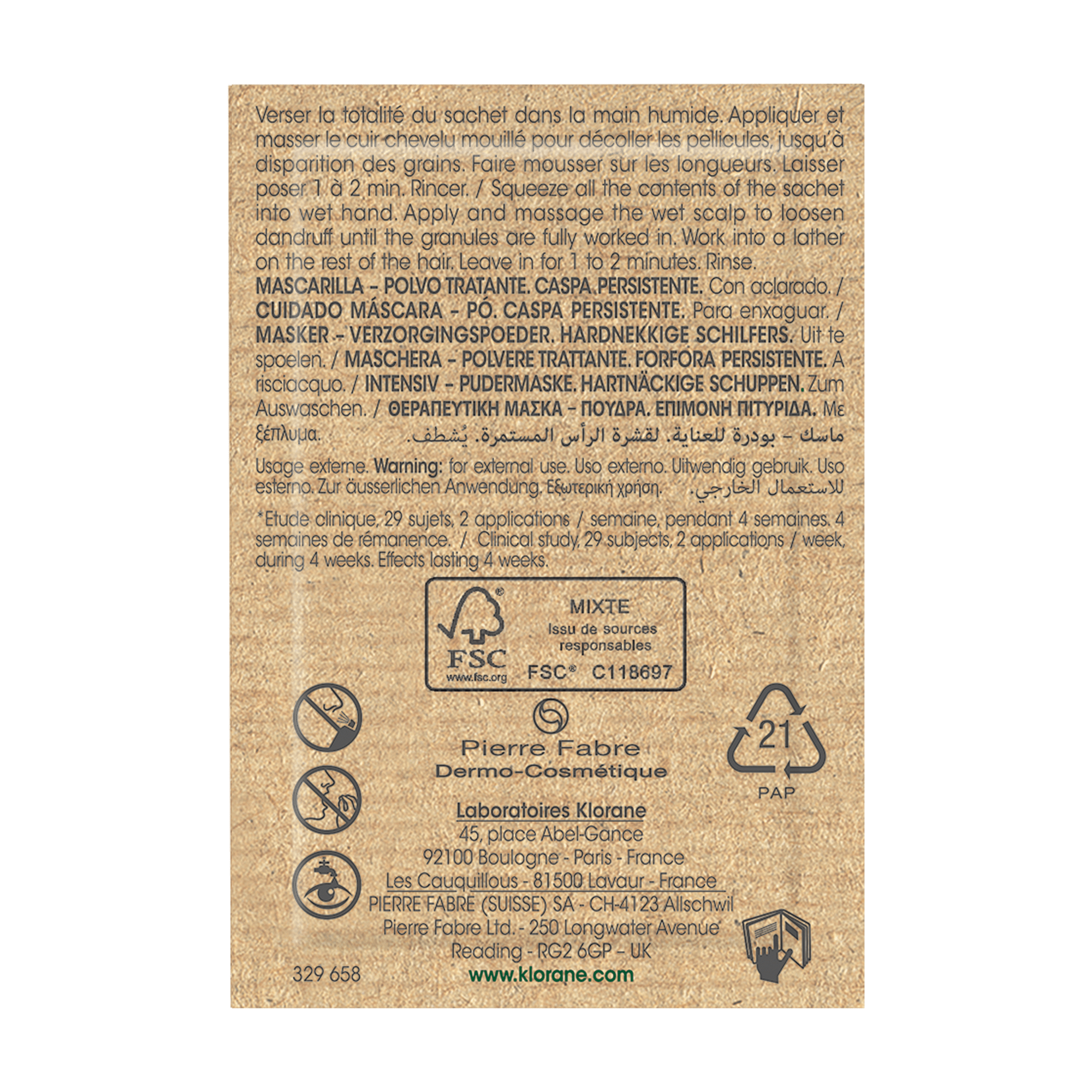 Contacto: Klorane Laboratoires Klorane, Les Cauquillous, 81506 Lavaur Cedex, France ; contact.klorane@pierre-fabre.com