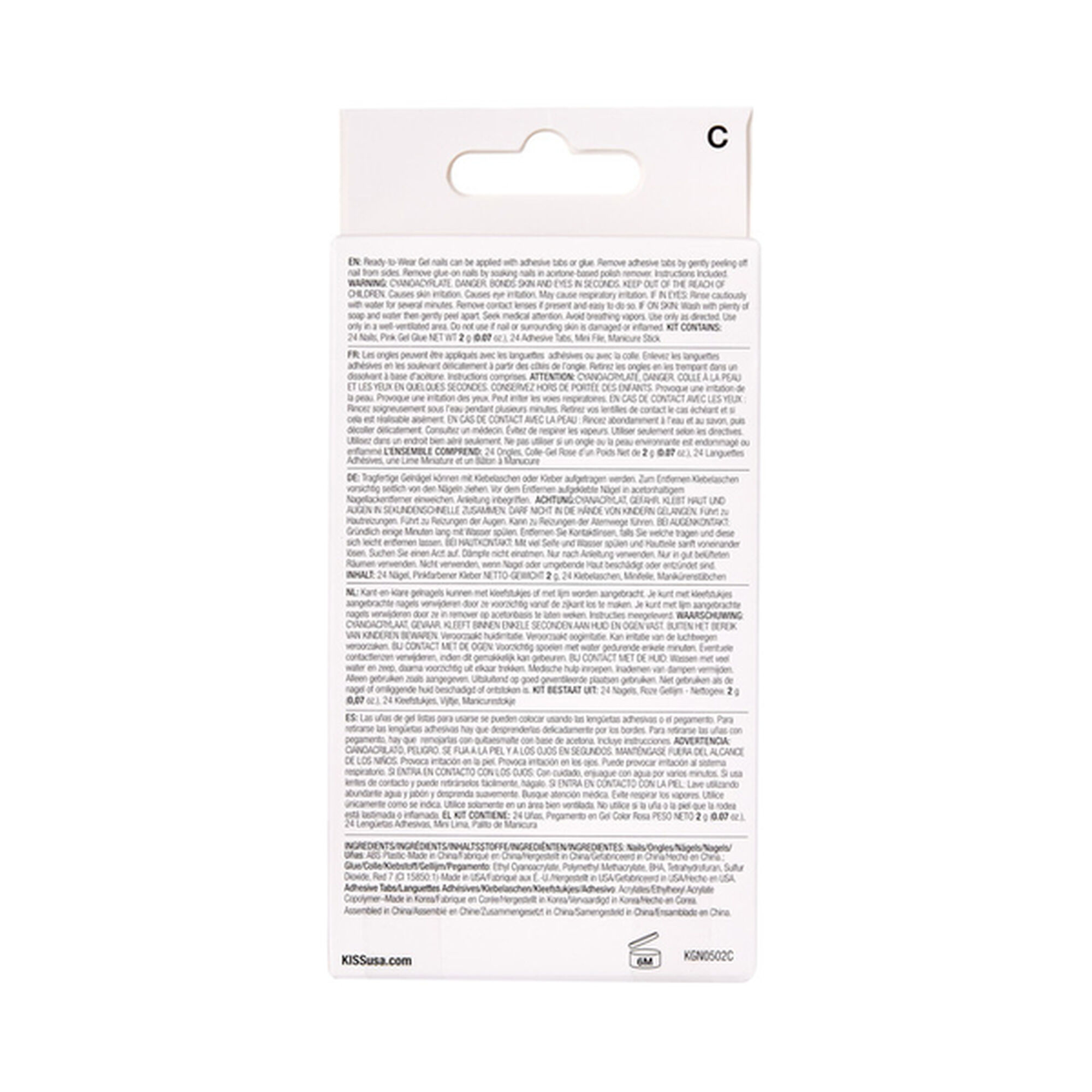 REMOVER: Não forçar ou arrancar a unha. Aparar e limar a superfície para perturbar a camada superior de protecção. Mergulhar as unhas em KISS All in One removedor de unhas artificial ou removedor de acetona até ficarem macias. Limpar as unhas amolecidas e colar.