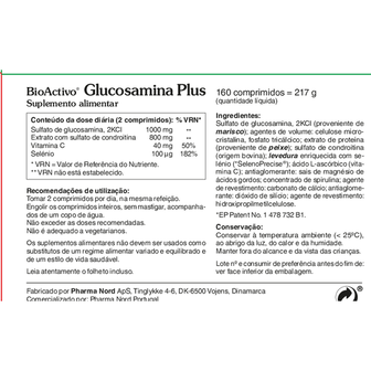 Sulfato de glucosamina, 2KCl (proveniente de marisco); agentes de volume: celulose microcristalina, fosfato tricálcido; extrato de proteina (proveniente de peixe); sulfato de condroitina (origem bovina); levedura enriquecida corn selénio (*SelenoPrecise®); ácido L-ascórbico (vitamina C); antiaglomerante: sais de magnésio de ácidos gordos; agente de revestimento: hidroxipropilmetilcelulose; antiaglomerante: dióxido de silício.