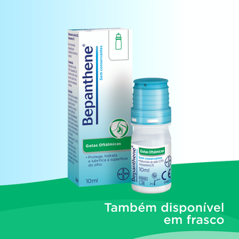 APLICAÇÃO Separe uma monodose. Certifique-se que cada monodose está intacta. Para abrir a monodose, torça a tampa achatada (não puxe). Incline a cabeça ligeiramente para trás, olhe para cima e afaste a pálpebra inferior do olho e aplique uma gota no saco conjuntival do olho 3-5 vezes ao dia. Feche os olhos lentamente para permitir uma distribuição uniforme do líquido na superfície ocular. Se o desconforto persistir ou piorar, consulte o seu oftalmologista. ADVERTÊNCIAS E PRECAUÇÕES ESPECIAIS DE UTILIZAÇÃO • Não utilize o produto se a monodose estiver danificada. • Não toque com a monodose no olho. • Não utilize se for alérgico a qualquer um dos ingredientes. • Em casos muito raros, a aplicação de gotas oftálmicas pode causar irritação em olhos muito sensíveis. • Apenas para uso único; como Bepanthene® Gotas Oftálmicas não contém conservantes, qualquer solução que não seja utilizada de imediato após abertura da monodose deve ser rejeitada. • Se utiliza outras gotas/pomadas oftálmicas, aguarde aproximadamente 15 minutos. Bepanthene® Gotas Oftálmicas deve ser sempre utilizado no final. • Não utilize em caso de infeção ou ferida ocular. • Durante um breve período de tempo após a aplicação pode ocorrer visão turva temporária; evite conduzir, utilizar máquinas e aguarde até que a visão volte ao normal. • Não utilize as gotas oftálmicas após o final do prazo de validade indicado em cada monodose, e na embalagem exterior. CONSERVAÇÃO Conservar a uma temperatura entre 2ºC e 25ºC. Não congelar. Conservar as monodoses na embalagem exterior para proteger da luz.