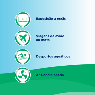 Hidrata e lubrifica a superfície do olho. Alívio prolongado do desconforto associado a stress ambiental, por exemplo induzido por ar condicionado, vento ou ar poluído, nomeadamente, por fumo de cigarro. Stress visual resultante do esforço da vista, por exemplo, ao ecrã do computador, ao microscópio ou durante a condução prolongada de veículos. Dispositivo médico.