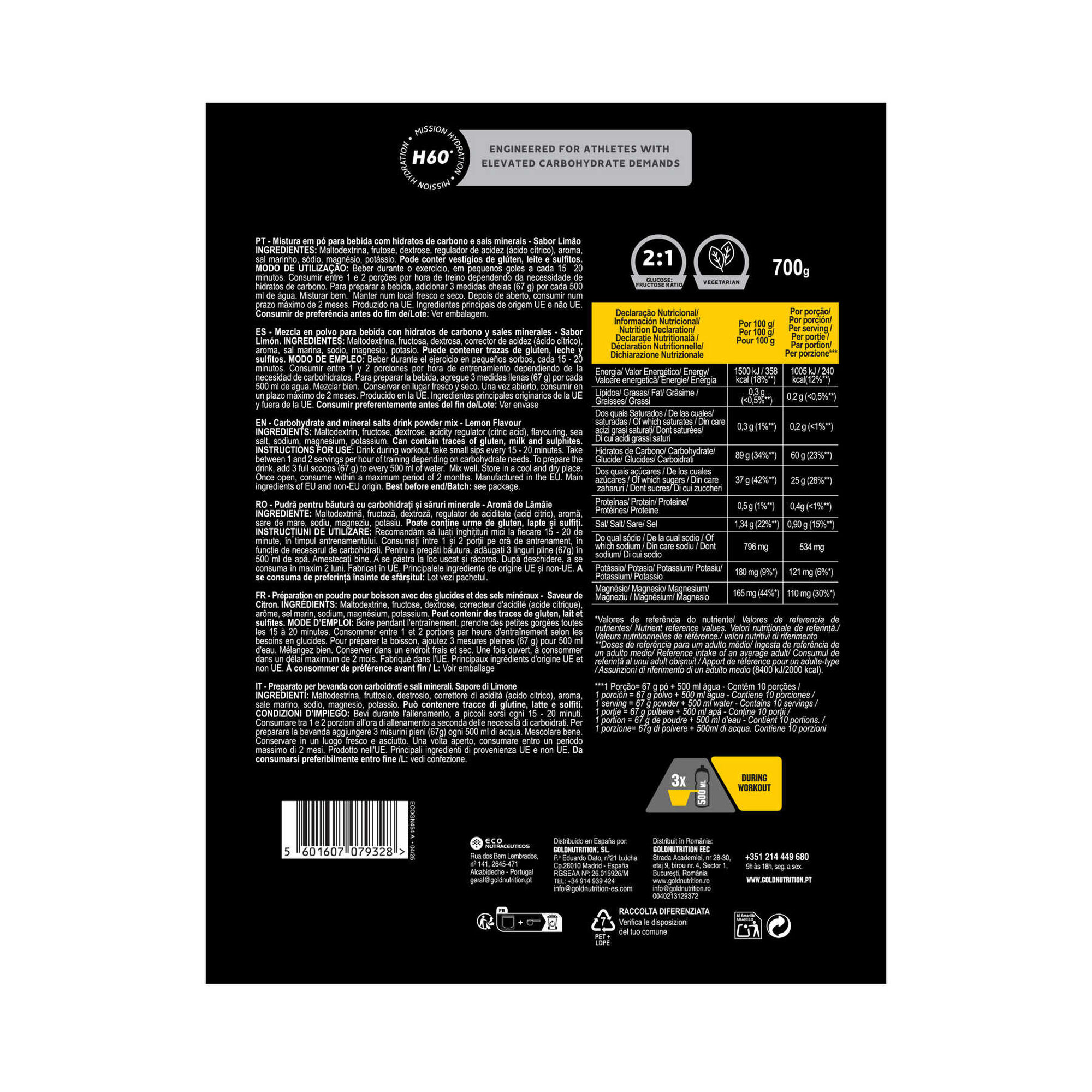 Cada dose fornece 60 g de hidratos de carbono de rápida absorção (maltodextrina, frutose e dextrose), numa combinação que assegura reposição energética eficaz e manutenção da glicemia durante o exercício.