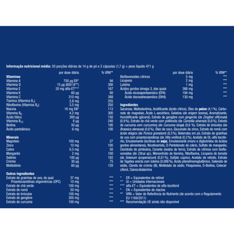 Suporte de micronutrientes para adultos, com extratos de plantas, ácidos gordos ómega-3, vitaminas e minerais, ácidos gordos omega-3, vitamina A, vitamina B2, Vitamina B6, vitamina B12, vitamina C, biotina e niacina, ácido pantotênico, ácido fólico, e magnésio.