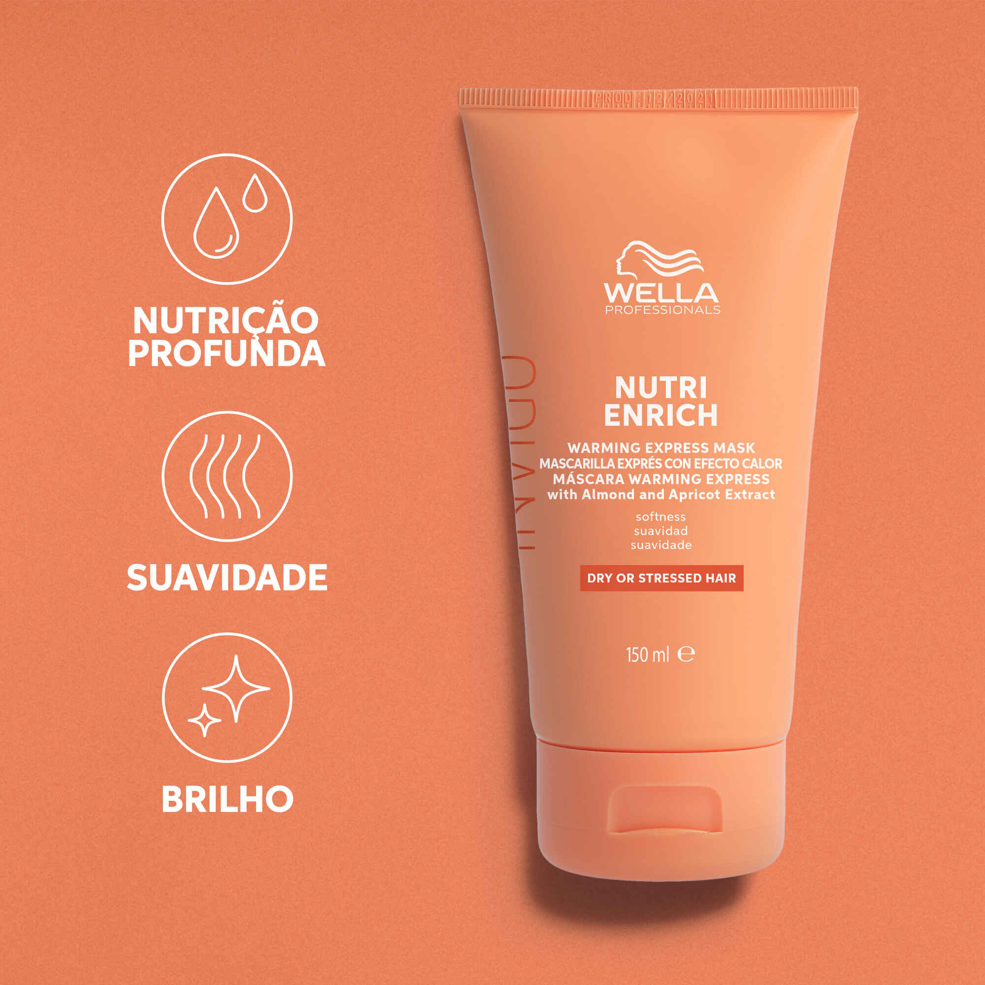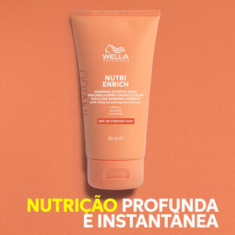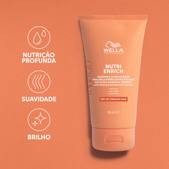 A Máscara Capilar Invigo Nutri-Enrich da Wella Professionals com extrato de amêndoas e alperce é um tratamento com efeito de auto aquecimento que proporciona brilho e suavidade ao cabelo seco ou fragilizado.