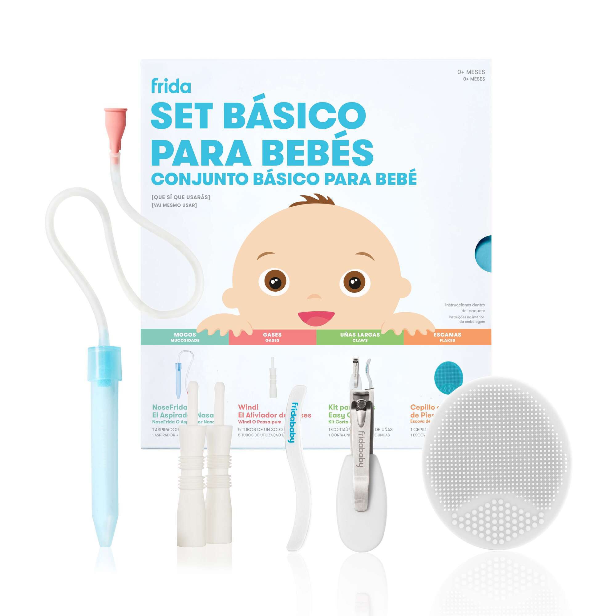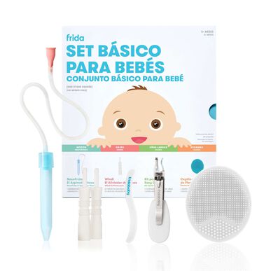 Pack composto por: 1 NoseFrida (aspirador nasal) + 4 filtros descartáveis para evitar a transferência de muco. 5 tubos Windi (tubos descartáveis para aliviar gases). 1 conjunto NailFrida Snipper Clipper (corta‑unhas para bebés) + 1 lima de unhas em “S‑curve” para alisar bordos ásperos. 1 DermaFrida SkinSoother, uma escova de banho em silicone para cuidar da pele sensível, ajudando a combater a costra láctea. 1 estojo com fecho (zip) para guardar todos os elementos do kit.