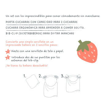 O conjunto "on the go" é ideal para transportar o que é necessário para o seu bebé comer fora de casa. O conjunto é composto por uma colher ergonómica ideal para papinhas, um porta-colher com capacidade para duas colheres e um porta-babete.
