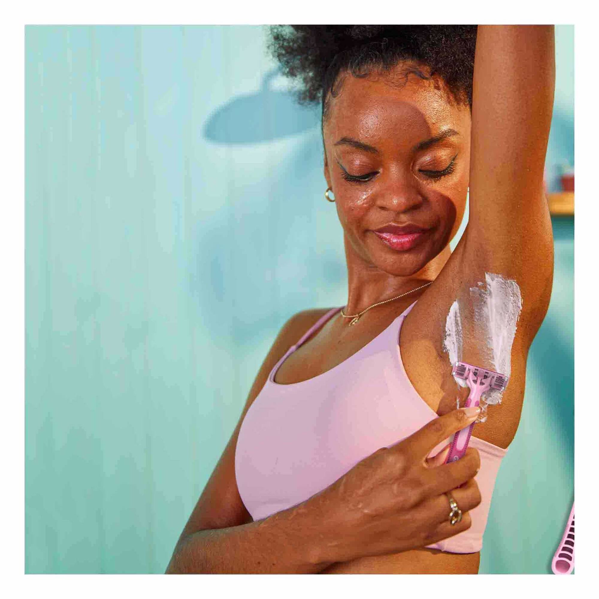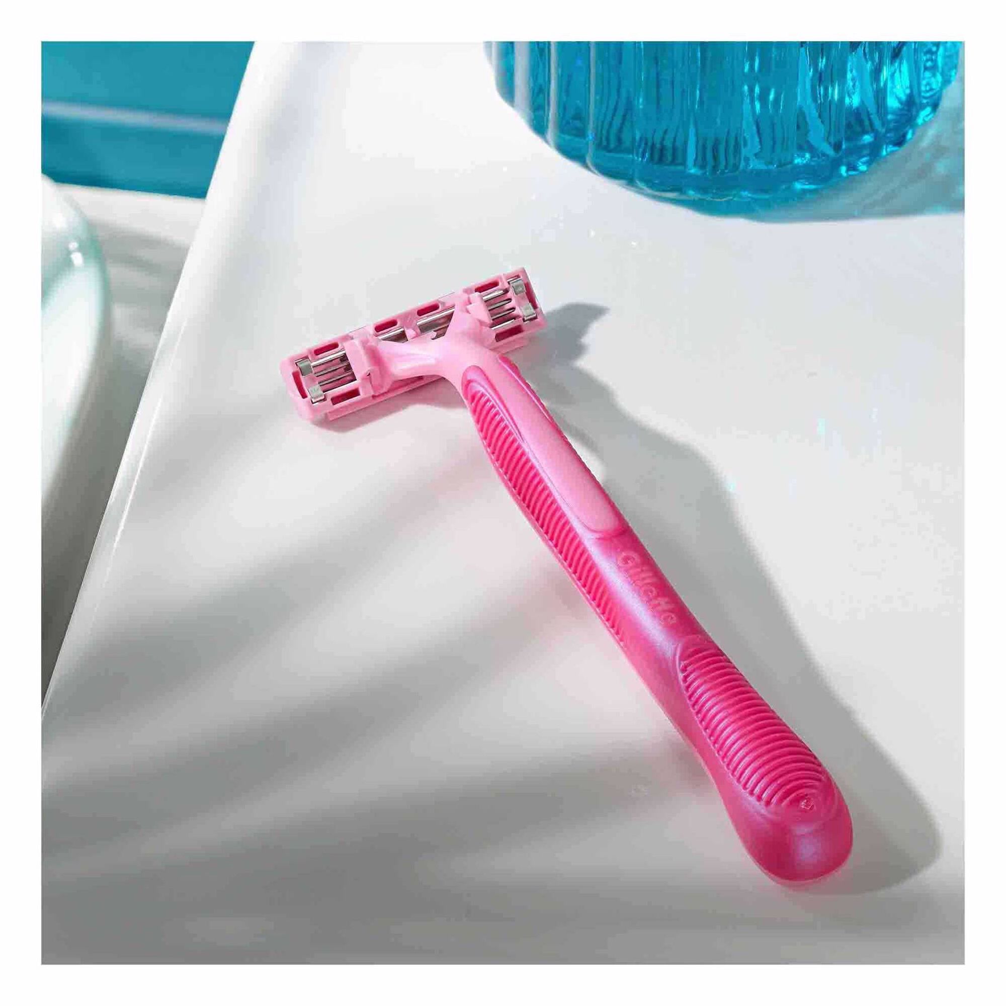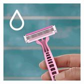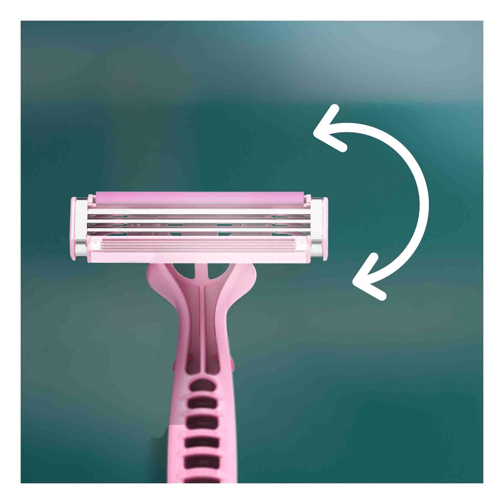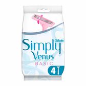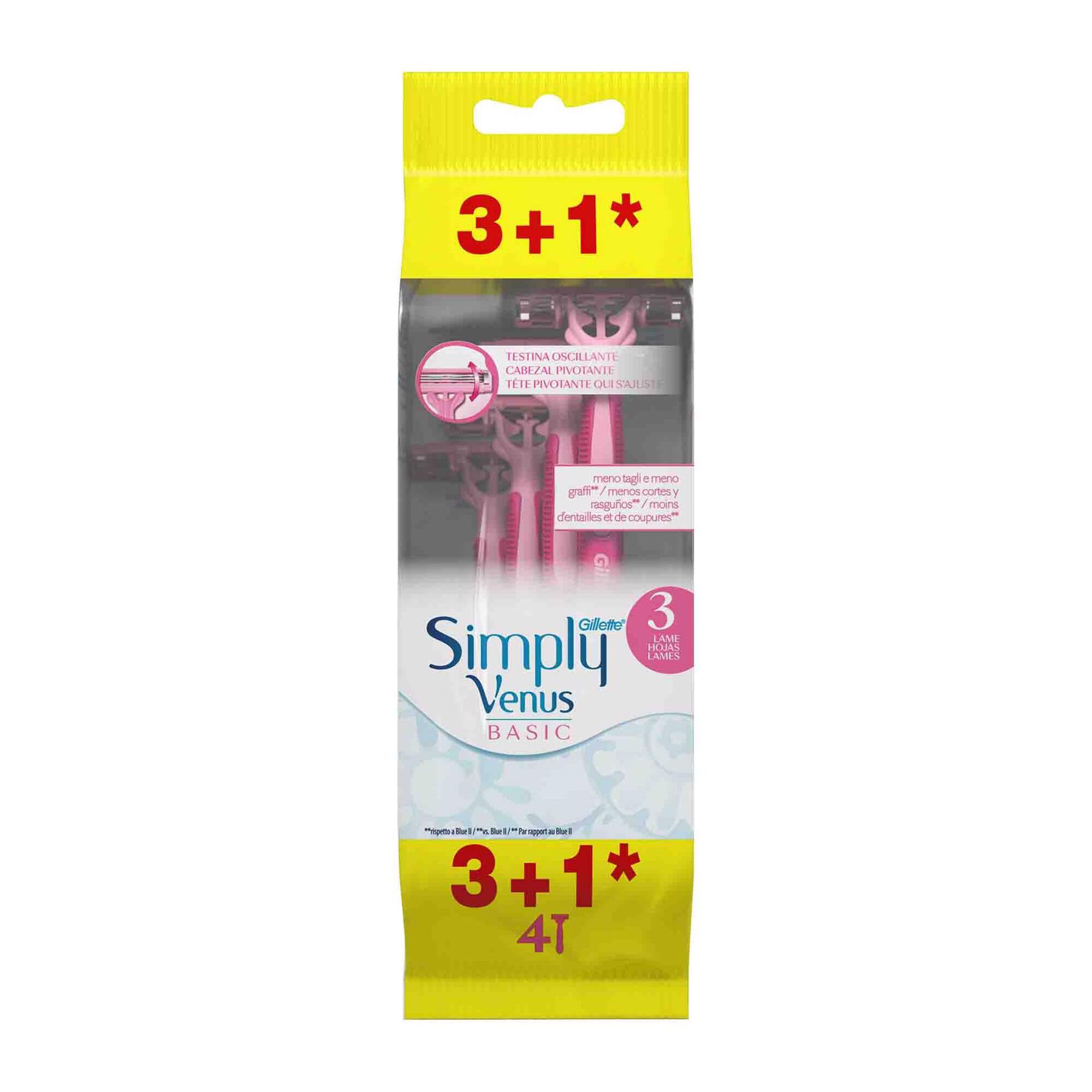 As máquinas de depilação descartáveis Gillette Simply Venus 3 Basic incluem uma cabeça oscilante com três lâminas, uma tira MoistureRich para um deslizar suave e um cabo confortável.