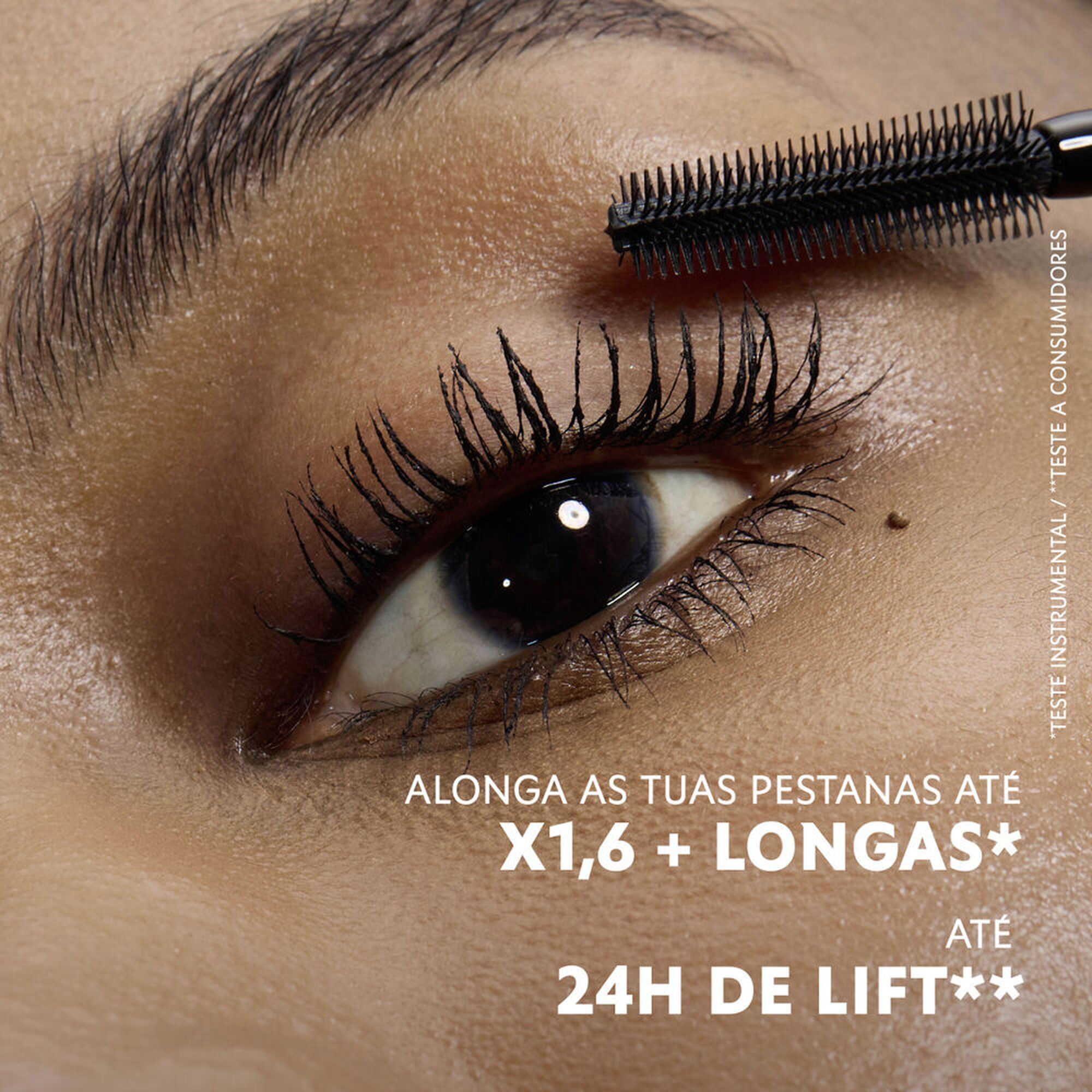 Aplicar a partir da base das pestanas em movimentos de ziguezague para alongar e elevar e depois criar volume com movimentos ascendentes. Fazer oscilar na base durante 3 segundos para fixar a elevação. Remover com desmaquilhante bifásico.