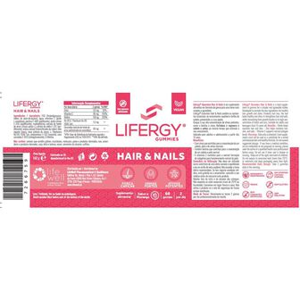 Lifergy Gummies Hair & Nails é um suplemento alimentar em formato de goma que contribui para o fortalecimento e regeneração do cabelo e unhas ao mesmo tempo que estimula o seu crescimento. Indicado para adultos e adolescentes a partir dos 15 anos. Contém os nutrientes essenciais ao crescimento saudável e brilho do cabelo, prevenindo a sua queda. Graças à sua alta concentração de ativos potentes como a biotina e zinco, fortalece e regenera o cabelo e unhas ao mesmo tempo que estimula o seu crescimento. Indicado para adultos e adolescentes a partir dos 15 anos.
