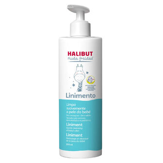 Halibut Muda Fraldas Linimento 200ml, linimento sem sabão nem necessidade de enxaguar, ideal para uma limpeza suave da pele do bebé a cada muda de fralda.