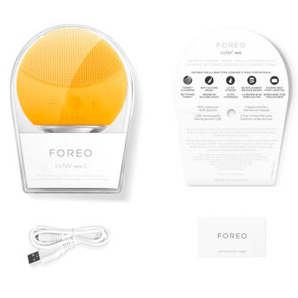 O dispositivo de limpeza facial LUNA mini 2 limpa profunda e eficazmente o rosto para uma pele suave e luminosa.