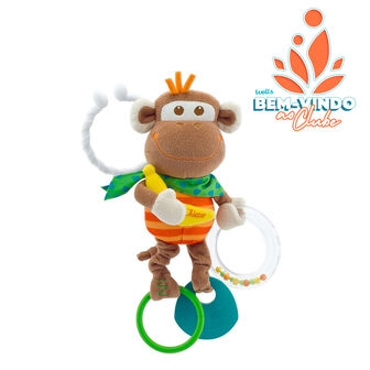 Macaquinha em peluche com clip, anel com barulhinhos e plástico macio para a dentição do bebé.