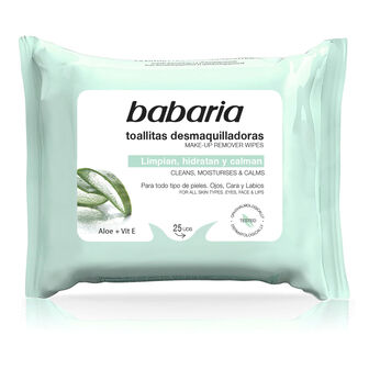 Toalhitas desmaquilhantes de Aloé Vera que limpam, hidratam e acalmam a pele, removendo todos os vestígios de maquilhagem dos olhos, rosto e lábios. Fórmula enriquecida com Vitamina E.