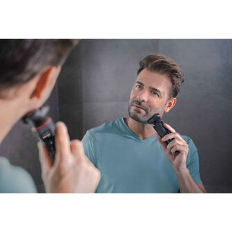 Este aparelho conta com uma cabeça de corte tripla flexível a 360°, com fixação magnética que facilita a remoção. Inclui função de bloqueio de viagem e um display LED que indica o nível da bateria, o bloqueio de viagem, o estado de carregamento e a necessidade de manutenção.