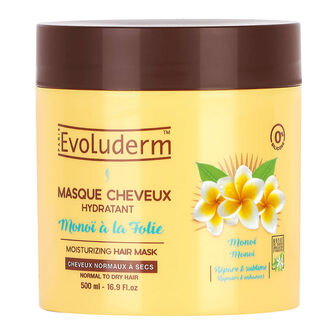 A máscara de cabelo hidratante Monoi à la Folie da Evoluderm revitaliza profundamente o cabelo e torna-o macio e sedoso sem pesar, graças ao seu ingrediente de manteiga de Karité.