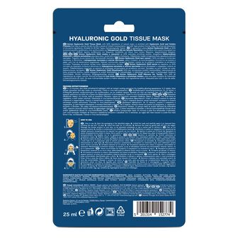 A Máscara de Rosto em Tecido Biodegradável Hyaluronic Gold contém 94% de ingredientes de origem natural.
