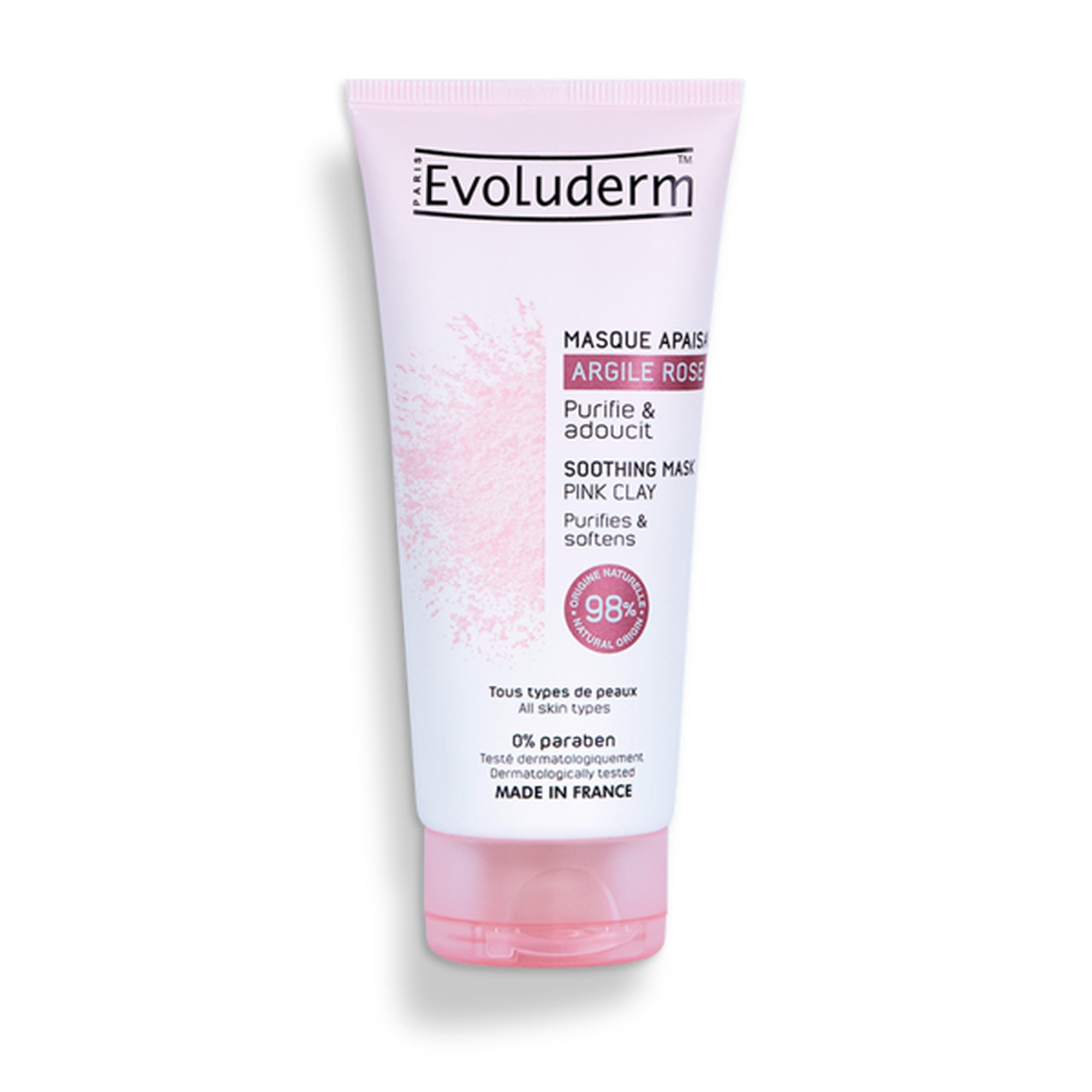 A máscara facial calmante de argila Pink Clay da Evoluderm acalma instantaneamente a pele.