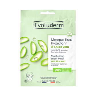 A máscara facial hidratante Aloe Vera Masque Tissu da Evoluderm hidrata e cuida de todos os tipos de pele com a sua fórmula enriquecida com aloé vera e ácido hialurónico.