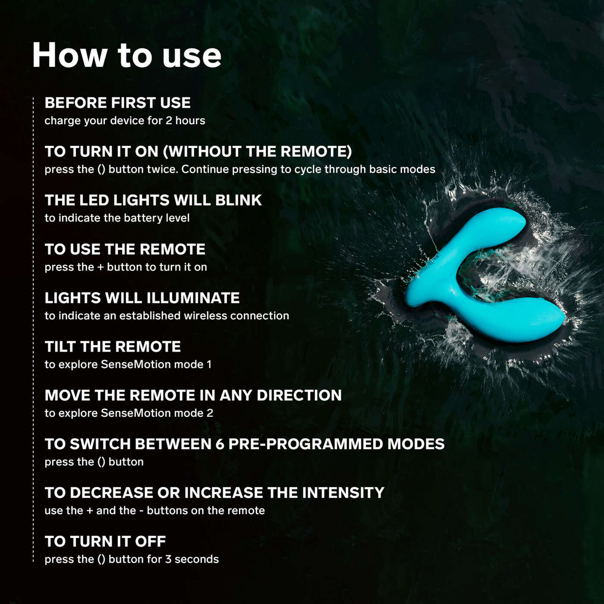 Insere o HUGO™, respirando profundamente até te sentires confortável, certificando-te de que a base alargada fica confortavelmente do lado de fora. Liga-o. Alterna entre diferentes definições até encontrares a intensidade perfeita e desfruta de um clímax mais longo e poderoso.