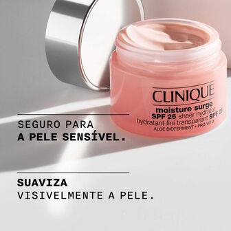 O Creme Facial Hidratante Moisture Surge™ SPF 25 Sheer Hydrator apresenta uma textura "nuvem" que proporciona a hidratação do icónico hidratante Moisture Surge™ e proteção solar translúcida, mesmo para tons de pele mais escuros.