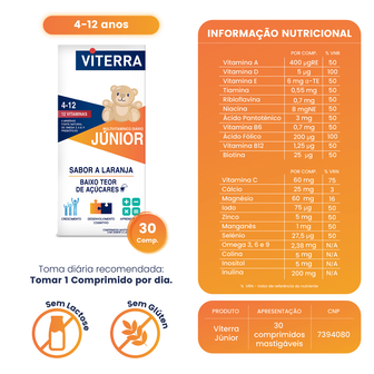 Edulcorante: Xilitol (xilitol, carboximetilcelulase); Inulina (frutooligossacarídeos); Magnésio (Hidróxido de magnésio, amido pré gelatinizado); Corante; Aroma sumo de laranja (maltodextrina, substâncias aromatizantes naturais e sintéticas, dióxido de silício, vitamina E); Cálcio (carbonato de cálcio, maltodextrina); Vitamina C ( ácido L-ascórbico, hidroxipropilmetilcelulose); Niacina ( Nicotinamida, mistura de mono e diglicerídeos de ácidos gordos alimentares, dióxido de silício); Antioxidante: ácido cítrico; Corante; Aroma de limão (maltodextrina, sacarose, goma-arábica, substâncias aromatizantes de laranja. triacetina, alfa-tocoferol); Antiaglomerante: Dióxido de Silício; Humidificante: Ácido esteárico; Zinco (Óxido de zinco, mono e diglicerídeos); Colina (colina bitartarato, dióxido de silício); Óleo de Linhaça (maltodextrina, amido de tapioca, palmitato de ascorbilo, ácido ascórbico e tocoferol); Humidificante: Estereato de magnésio; D-alfa-tocoferol (Vitamina E); Manganês (Sulfato de manganês, cera de qualidade alimentar); Inositol (mio-inositol); Vitamina A (DL-alfatocoferol, fosfato tricálcico); D-pantotenato de cálcio (Ácido Pantoténico); Corante: Dispersão Laranja (Dióxido de titânio, Óxido de ferro amarelo, Óxido de ferro vermelho vermelho); Vitamina B6 (Cloridrato de piridoxina, mono e diglicerídeos); Vitamina D (Maltodextrina, sacarose, acácia, amido de milho, triglicerídeos de cadeia média, Colecalciferol, DL-alfa-tocoferol); riboflavina (mono e diglilcerídeos, riboflavina, amido de milho); Tiamina (monicitrato de tiamina, mono e diglicerídeos); Ácido Fólico (Folato); (Folato); Vitamina B12 (cianocobalamina, Fosfato de di-cálcio); Iodeto de potássio (Iodo); Selenito de sódio (Selénio); D-biotina (Biotina).