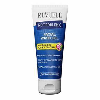 O Gel de Limpeza Facial No Problem AHA + BHA + PHA e Tea Tree atua removendo a sujidade, oleosidade e resíduos de maquilhagem do rosto, ao mesmo tempo que esfolia suavemente as células mortas da pele.
