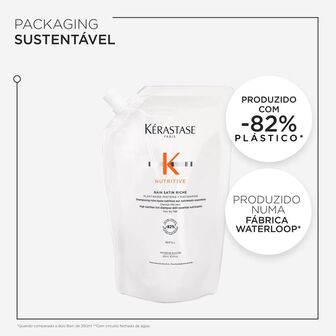 A embalagem de champô recarregável de 500 ml, produzida com plastico reciclado* numa fábrica que atingiu 100% de energia renovável**, pode ser recarregada com a recarga correspondente, produzida com -82% de plástico na embalagem* numa fábrica waterloop**.