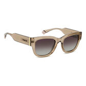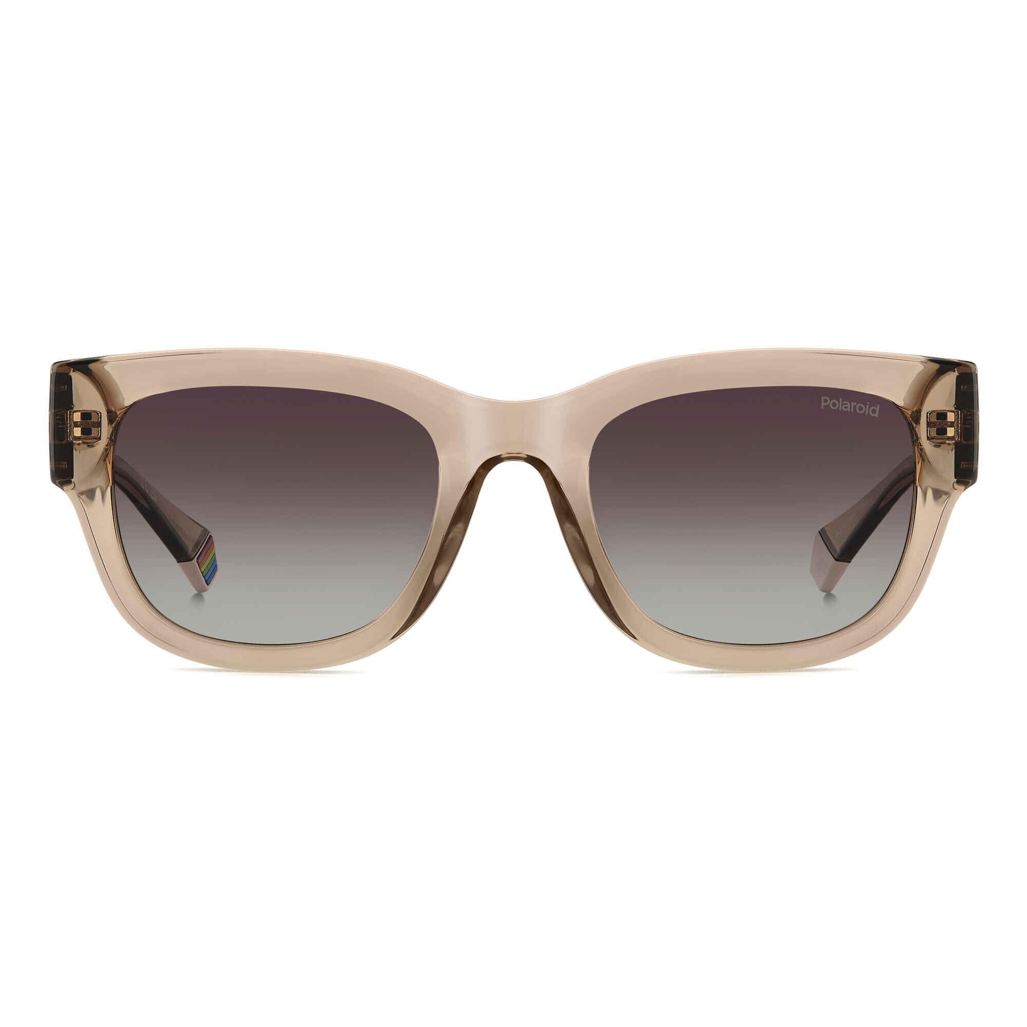 A Armação em tom bege é confortável e flexível. A cor da lente é castanho polarizado.