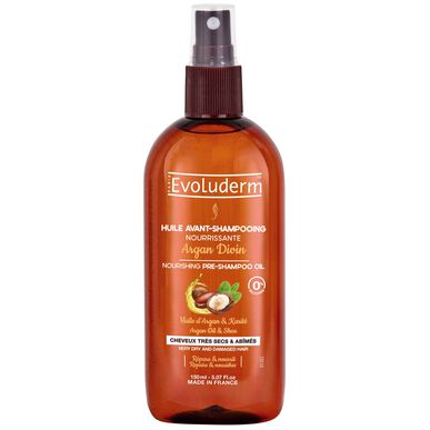 O óleo pré-champô nutritivo Argan Divin da Evoluderm repara e fortalece o cabelo graças à sua fórmula enriquecida com óleo de argan e manteiga de karité.
