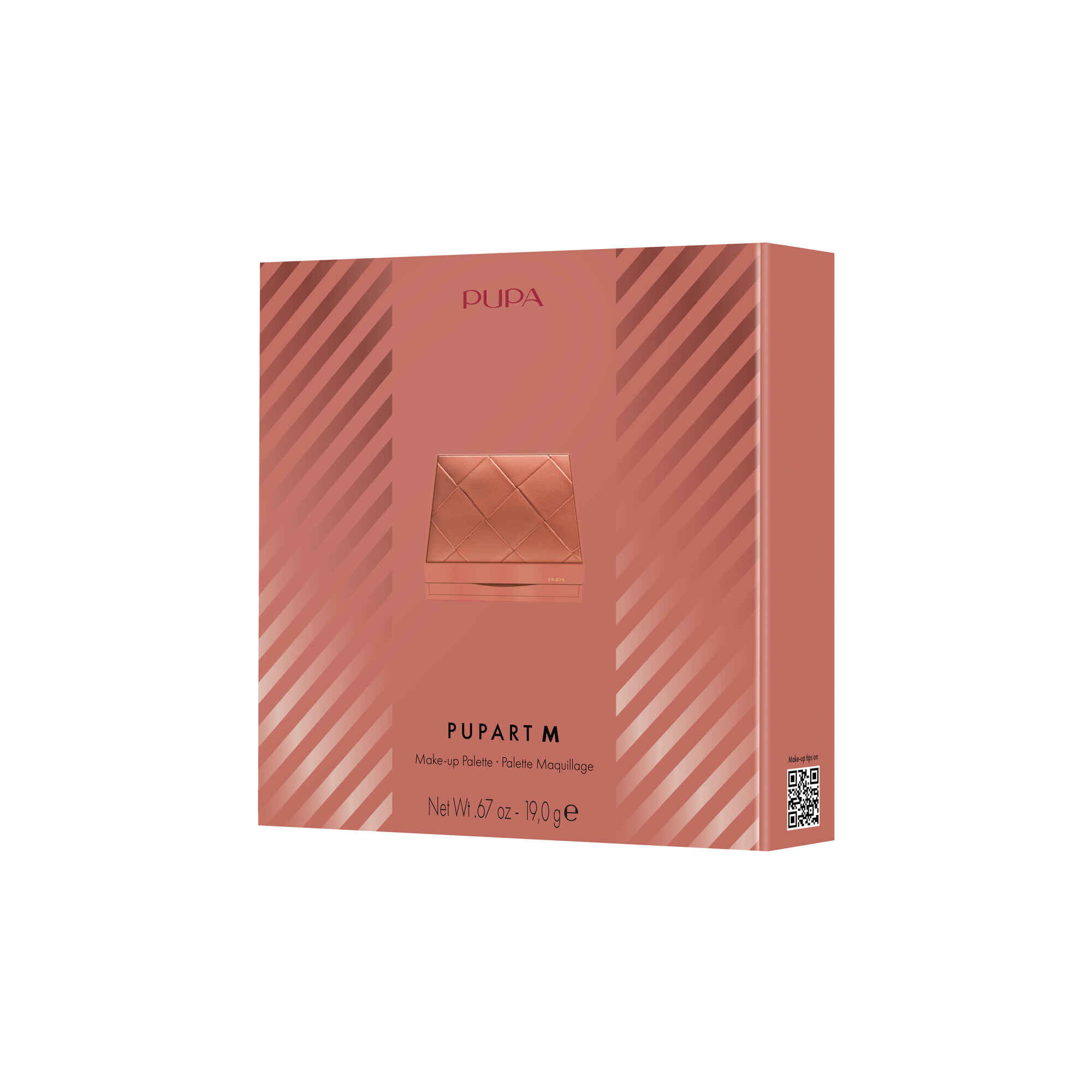 A paleta Pupart M é composta por 1 tom de blush, 8 tons de sombra em pó, 12 tons de lábios, 2 tons de iluminadores e 2 tons de corretores.