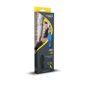 Palmilha de gel que reduz a carga de impacto sobre as articulações do tornozelo, joelho, anca e coluna vertebral. O seu forro suave e sedoso em veludo absorve a humidade do pé. Deve arejar-se regularmente.