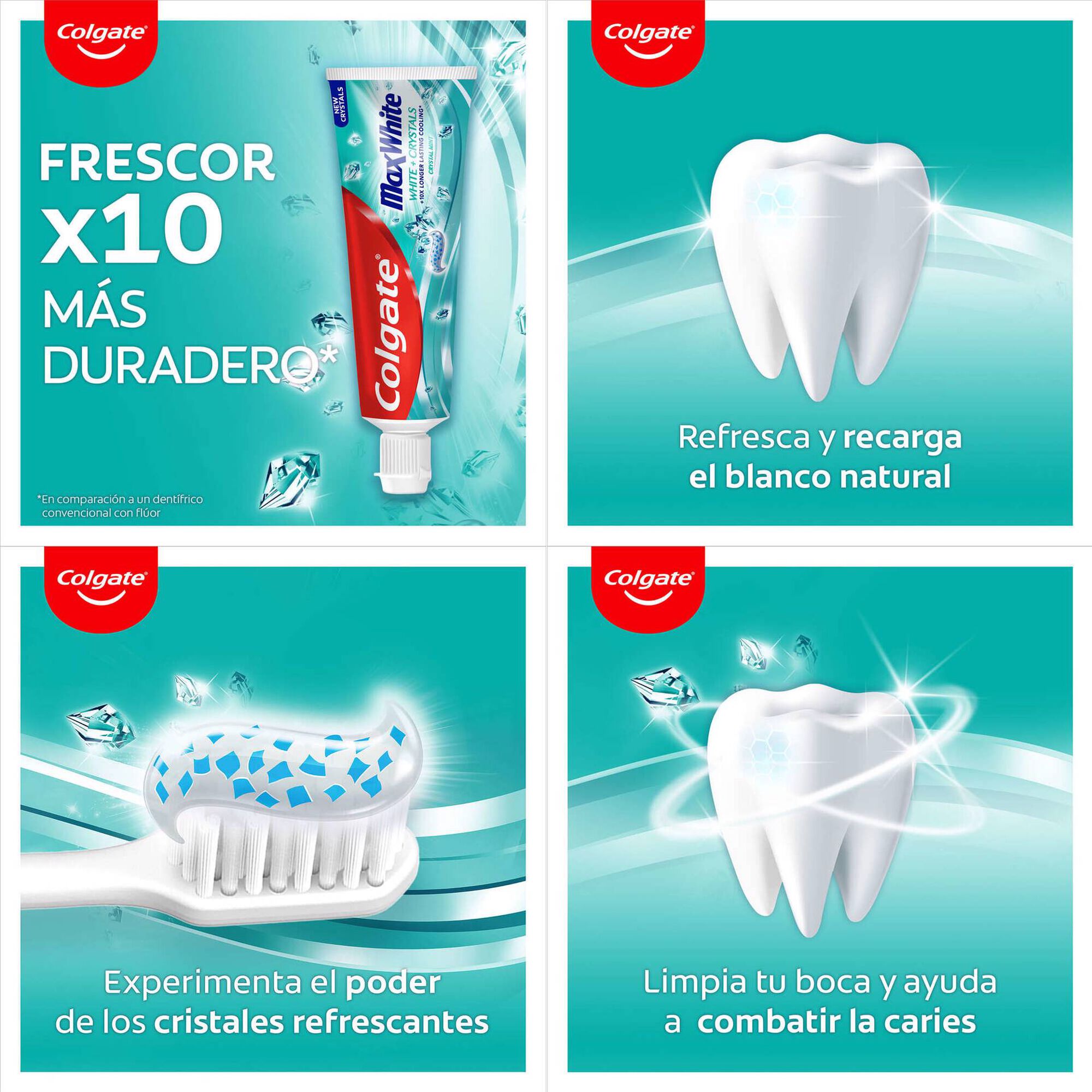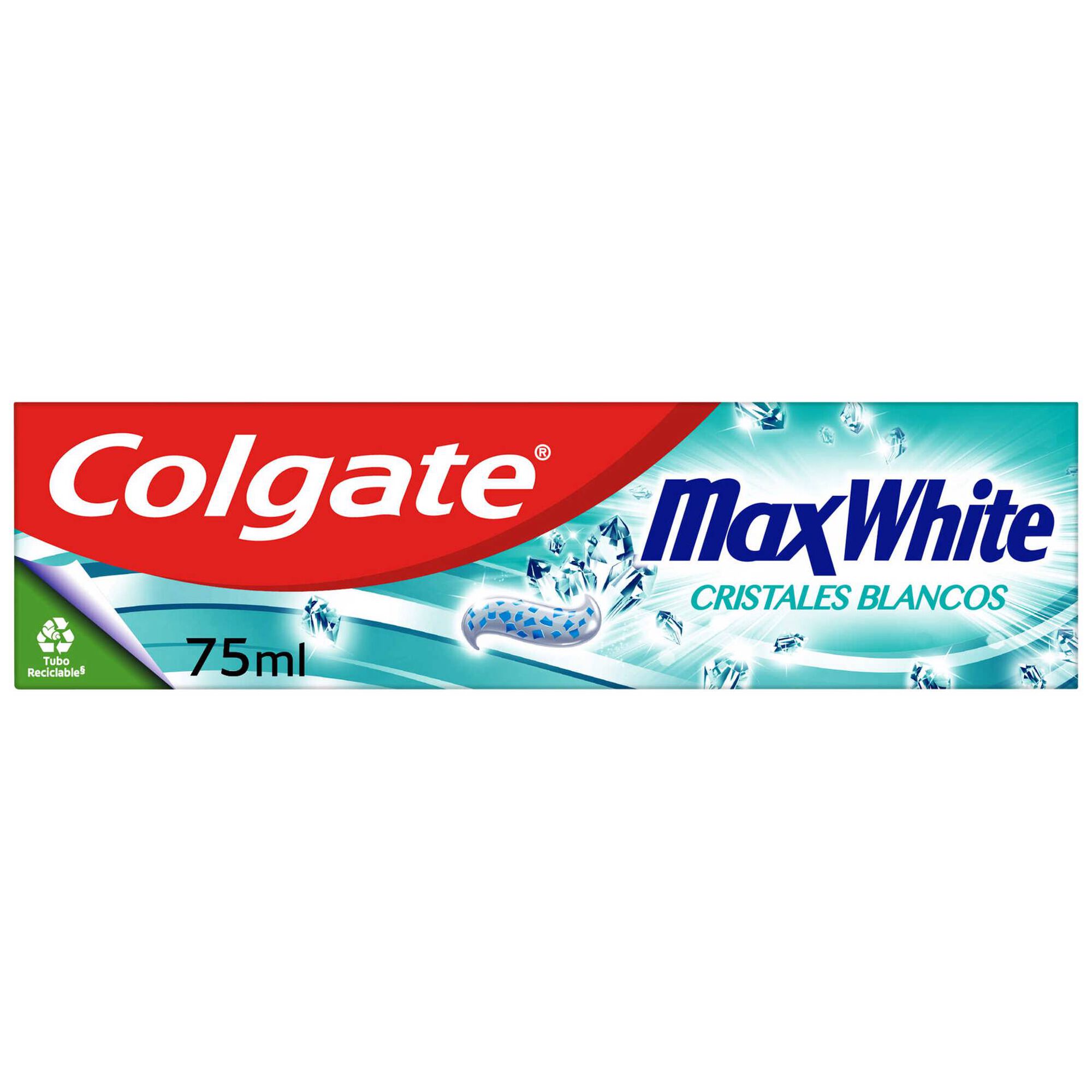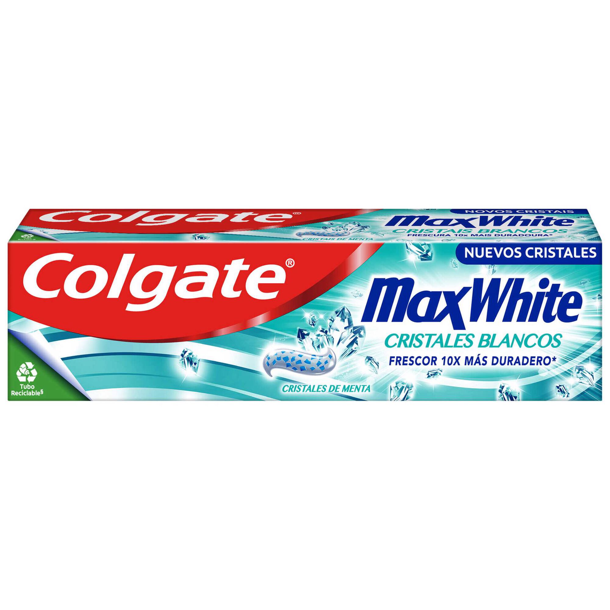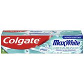 A Pasta Dentífrica Cristais Brancos Max White da Colgate contém flúor e centenas de microcristais brancos com hortelã.