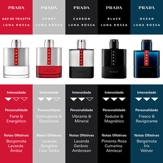 Prada Luna Rossa Carbon Eau de Toilette é um perfume Fougère Amadeirado, que mistura ingredientes icónicos e contrastantes: Lavanda, Gerânio e Ambroxan.