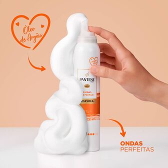 Espuma de cabelo nutritiva Pantene, infundida a combinação rica de vitamina pro-V óleo de argão, para cabelo ondulado de longa duração com uma definição suave e brilhante.