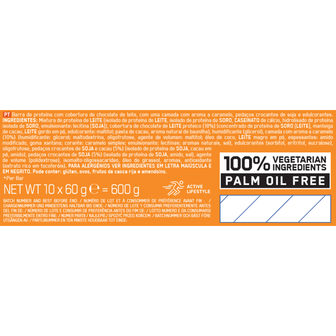 Uma barra proteica com cobertura de chocolate de leite, uma camada com sabor a caramelo, crispies de soja e edulcorantes.