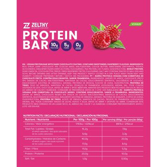 A Protein Bar Berry Boost da ZELTHY é uma barra proteica 100% vegan, feita à base de plantas com proteína de alta qualidade. Combina pedaços de framboesa liofilizada com um revestimento de chocolate preto, oferecendo um sabor doce e refrescante.