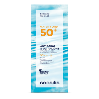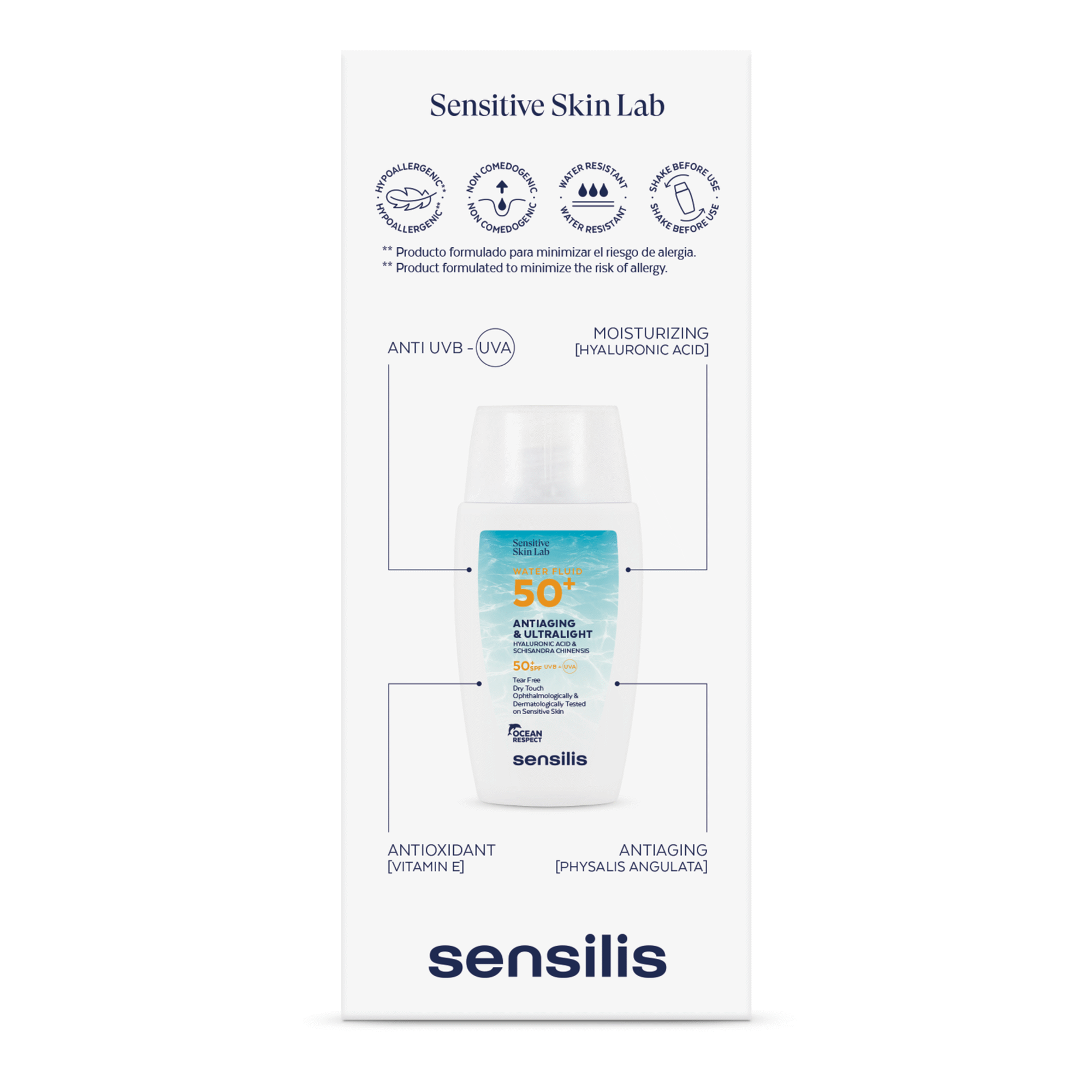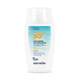 Fotoprotetor anti-envelhecimento ultra-fluido aquoso com SPF 50+.