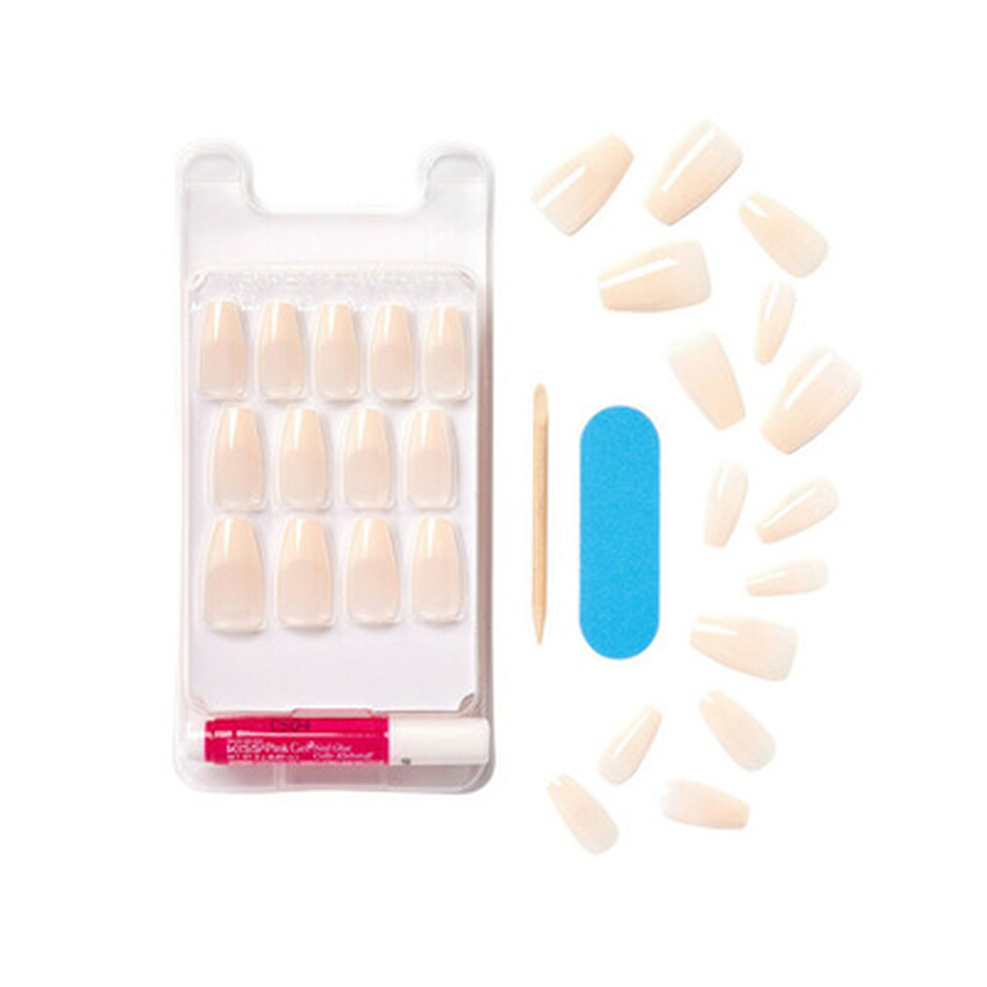O kit contém 28 unhas, cola de gel cor-de-rosa (2g), mini lima, stick de manicura