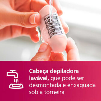 Com cabeça de precisão e diferentes acessórios, adapta-se facilmente a pernas, axilas, linha do biquíni e áreas mais delicadas.