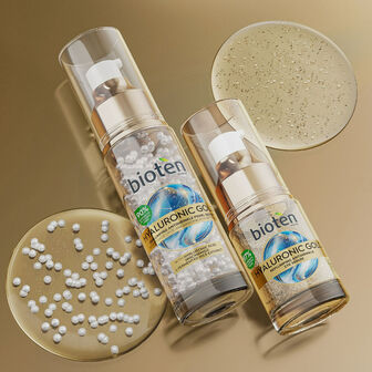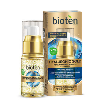 O sérum de olhos antirrugas preenchedor bioten HYALURONIC GOLD com 97% de ingredientes de origem natural, combate as rugas, os papos, o inchaço e as olheiras na delicada zona dos olhos.
