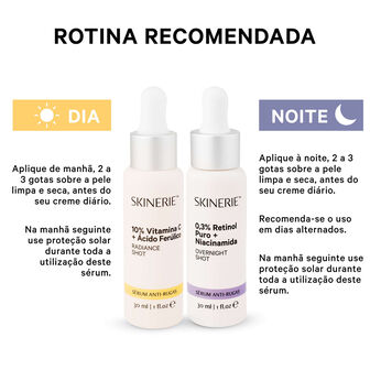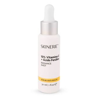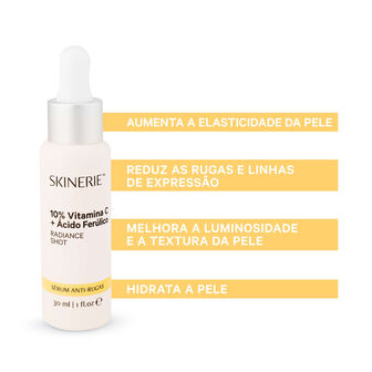 O Sérum Radiance Shot com 10% de Vitamina C e com Ácido Ferúlico é um cuidado de rosto especialmente desenvolvido para te proporcionar uma pele jovem e luminosa. A sua fórmula reduz as rugas e linhas de expressão, aumenta a elasticidade da pele, melhora a sua luminosidade e a textura, unificando o tom da pele, e assegura a sua hidratação.