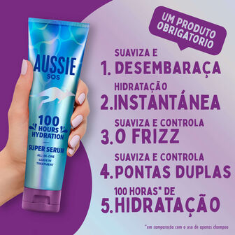 Cabelo seco e danificado a pedir ajuda? Diga olá aos dias de cabelo perfeito com o Tratamento Leave-In Aussie SOS Super Serum. O nosso maravilhoso sérum tudo em um hidrata instantaneamente, suaviza, amacia e desembaraça o cabelo.