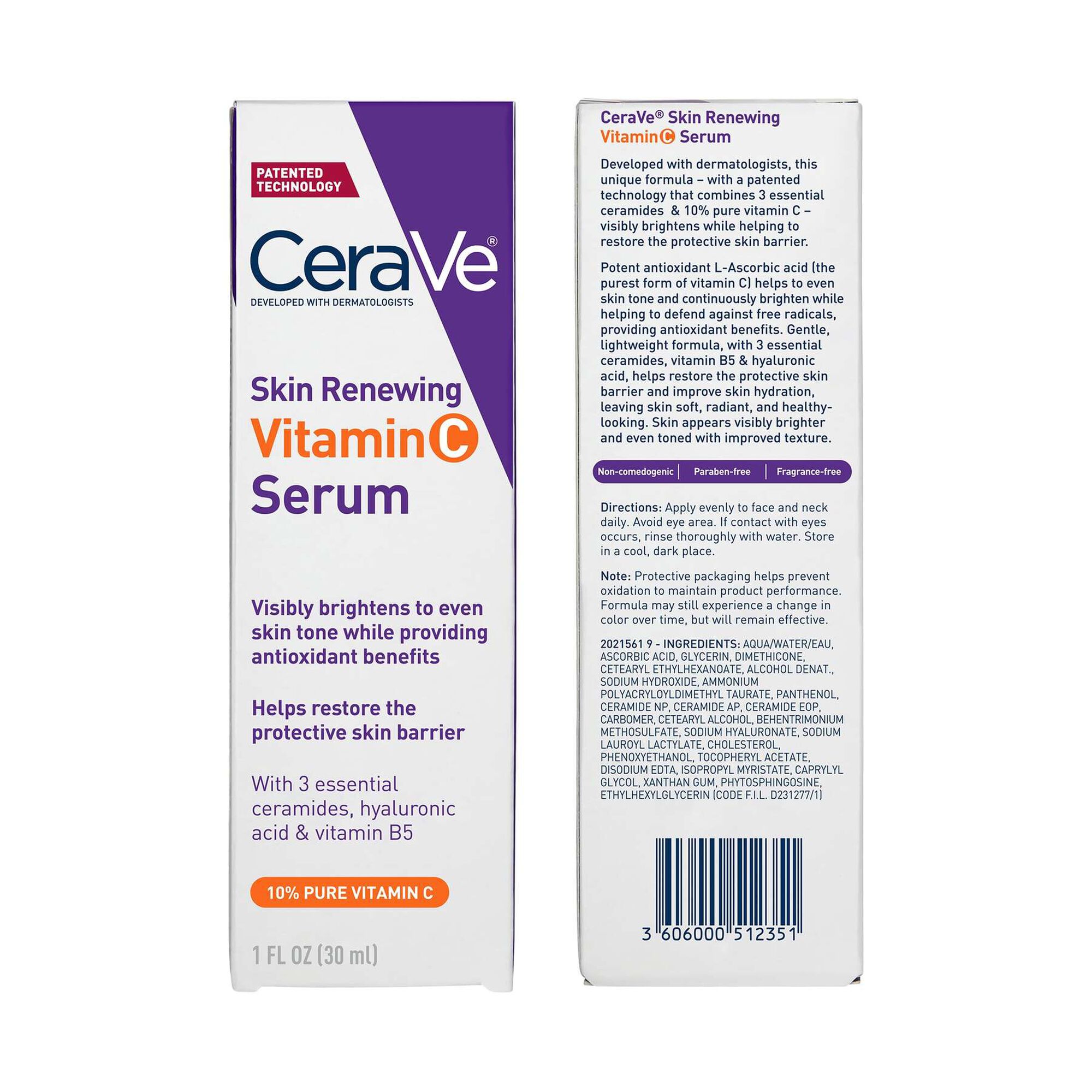 CeraVe Skin Renewing Sérum com Vitamina C ilumina visivelmente e uniformiza o tom da pele, reduzindo as rídulas e as rugas.