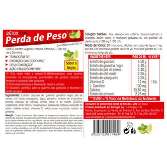 Detoxlim Perda de Peso é um Suplemento alimentar. É uma solução bebível preparada com plantas rigorosamente selecionadas, cafeína, vitamina C e L-carnitina. A sua fórmula exclusiva com sabor a Mojito ajuda a queimar gordura e a promover a perda de peso. Contém chá verde que inibe a catecol-O-Metiltransferase, uma enzima envolvida na termogénese (combustão) da gordura corporal e favorece a oxidação de gorduras, e favorece a eliminação renal e urinária. Contém ainda guaraná que contribui para a queima das gorduras e favorece a perda de peso.