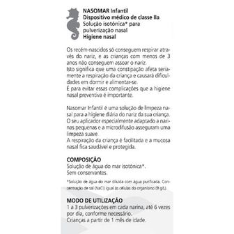 A concentração salina de Nasomar Infantil é a mesma que as células do organismo, permitindo a utilização diária por longos períodos de tempo, sem agressão ou alteração da mucosa.