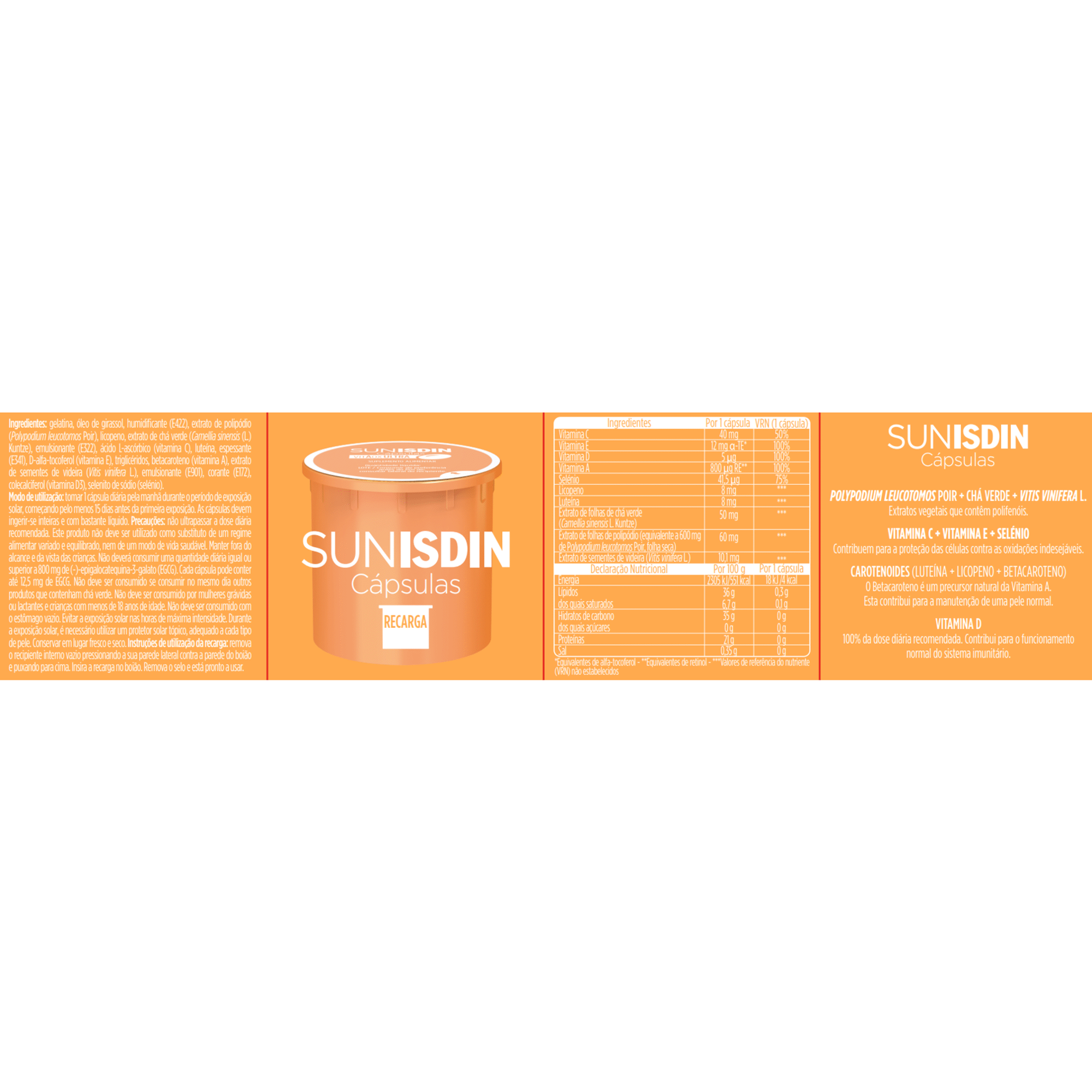 Isdin SunISDIN Recarga 30 Cápsulas Orais é um suplemento alimentar com vitaminas D, C e E que contribuem para a proteção celular contra o dano oxidativo.